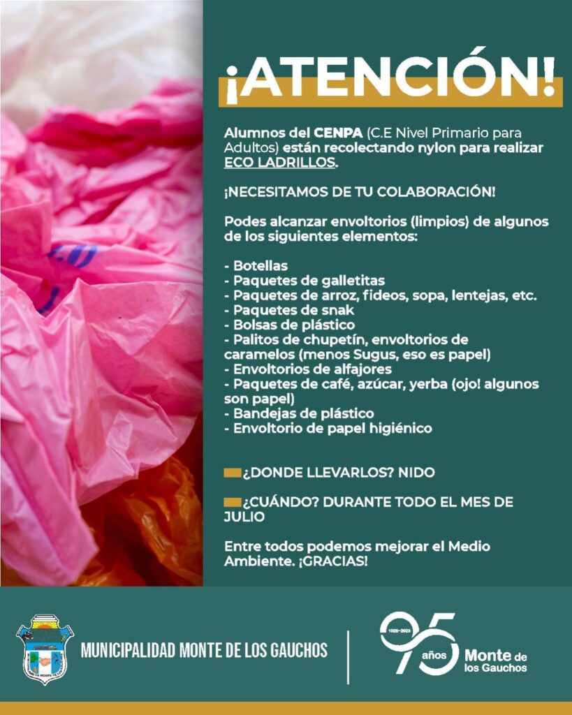Los alumnos del CENPA N°12 solicitan la colaboración de los vecinos de Monte de los Gauchos para la recolección de nylon, el cual será utilizado para realizar ECO LADRILLOS.