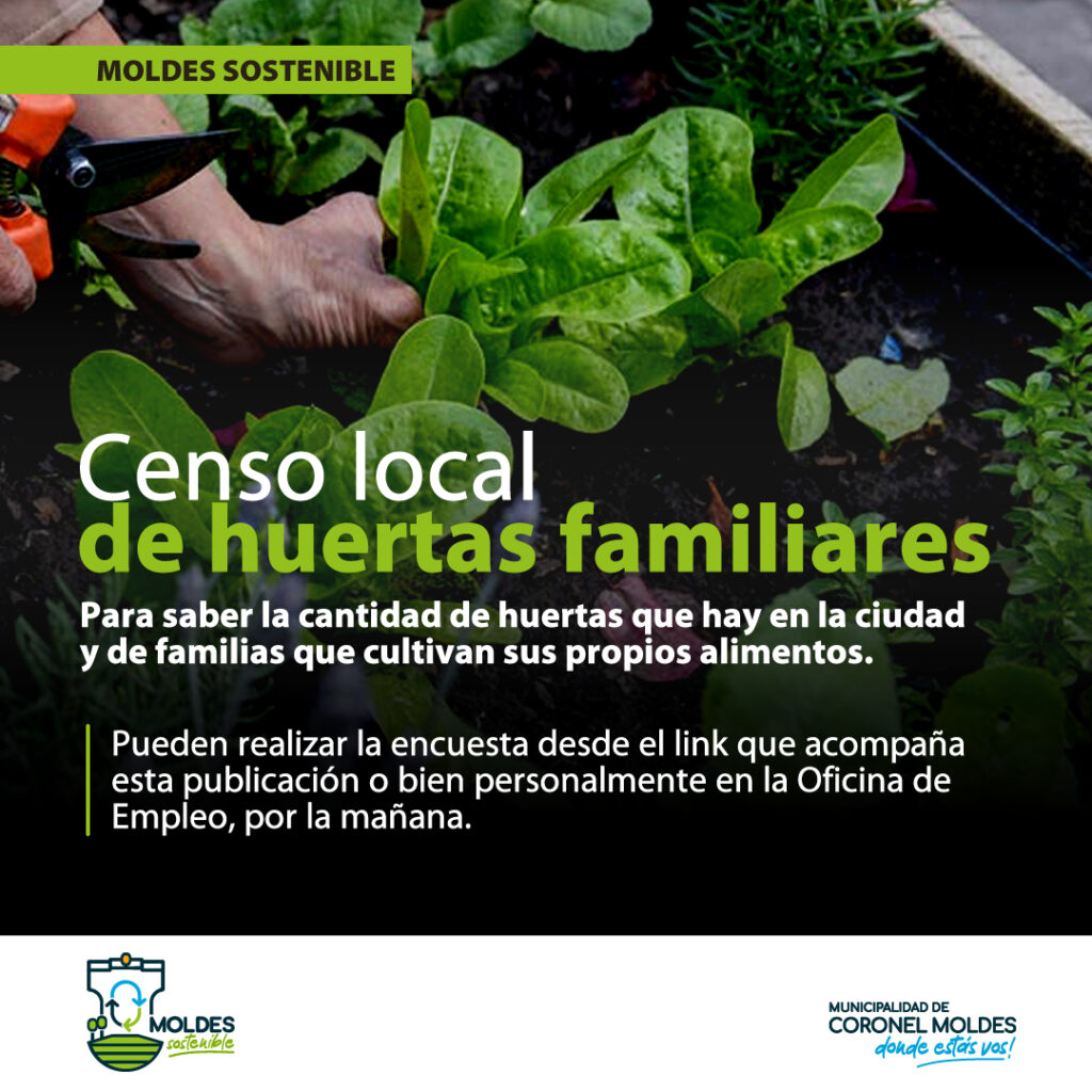 La Municipalidad de Coronel Moldes, invita a todos los vecinos de la localidad a realizar el censo local sobre huertas que desarrollan las familias de la ciudad, lo cual permitirá conocer cuántas familias cultivan sus propios alimentos y de qué manera lo hacen.