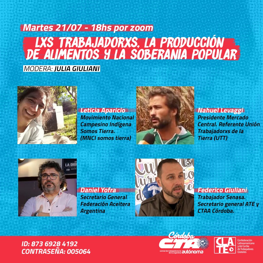 Debate necesario con una mirada sobre el rol de lxs Trabajadorxs y la Tierra, del Sector Privado y del Estado en la produccion de alimentos y el camino a construir Soberania Social y Popular junto a: Nahuel Levaggi (Presidente del Mercado Central) Leticia Aparicio(Movimiento Nacional Indigena Somos Tierra) DanielYofra (Sec Gral Federación Aceitera) y Federico Giuliani( Sec Gral de ATE y CTA-A Córdoba)