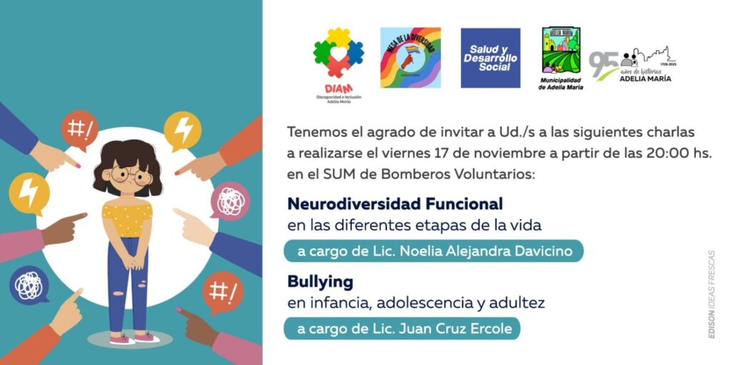 La Municipalidad de Adelia María invita a participar de las charlas sobre Neurodiversidad Funcional y Bullying, este Viernes 17 de Noviembre a las 20 hs.