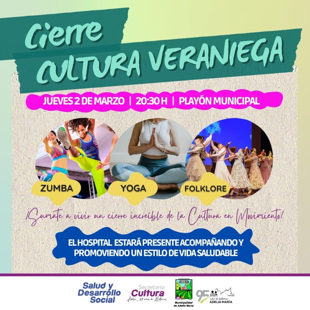Este Jueves 2 de Marzo a partir de las 20:30 hs en el Playón del Polideportivo Municipal de Adelia María se realizará el cierre de Cultura Veraniega.