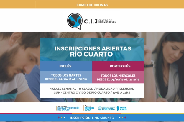 Se trata de cursos gratuitos de Inglés y Portugués en sus niveles iniciales que se dictarán en el SUM del Centro Cívico de Río Cuarto. Están orientados a jóvenes, de entre 18 y 35 años, que residan en la ciudad. Son dinámicos y poseen soporte multimedia, además de una plataforma virtual que les permite ir afianzando conocimientos y manteniendo vínculo fluido con los capacitadores.