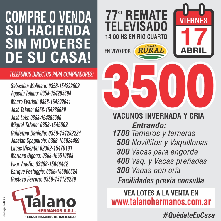 Talano Hermanos subastará 3500 vacunos de invernada y cría este viernes a las 14 por Canal Rural.