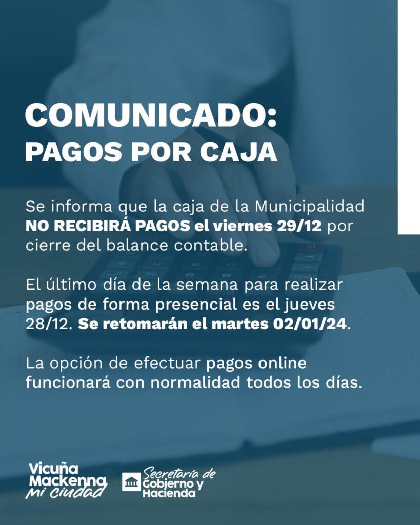 La Municipalidad informa que el Viernes 29/12 la caja estará cerrada por lo que no se recibirán pagos en efectivo hasta el día Martes 2/01/2024.