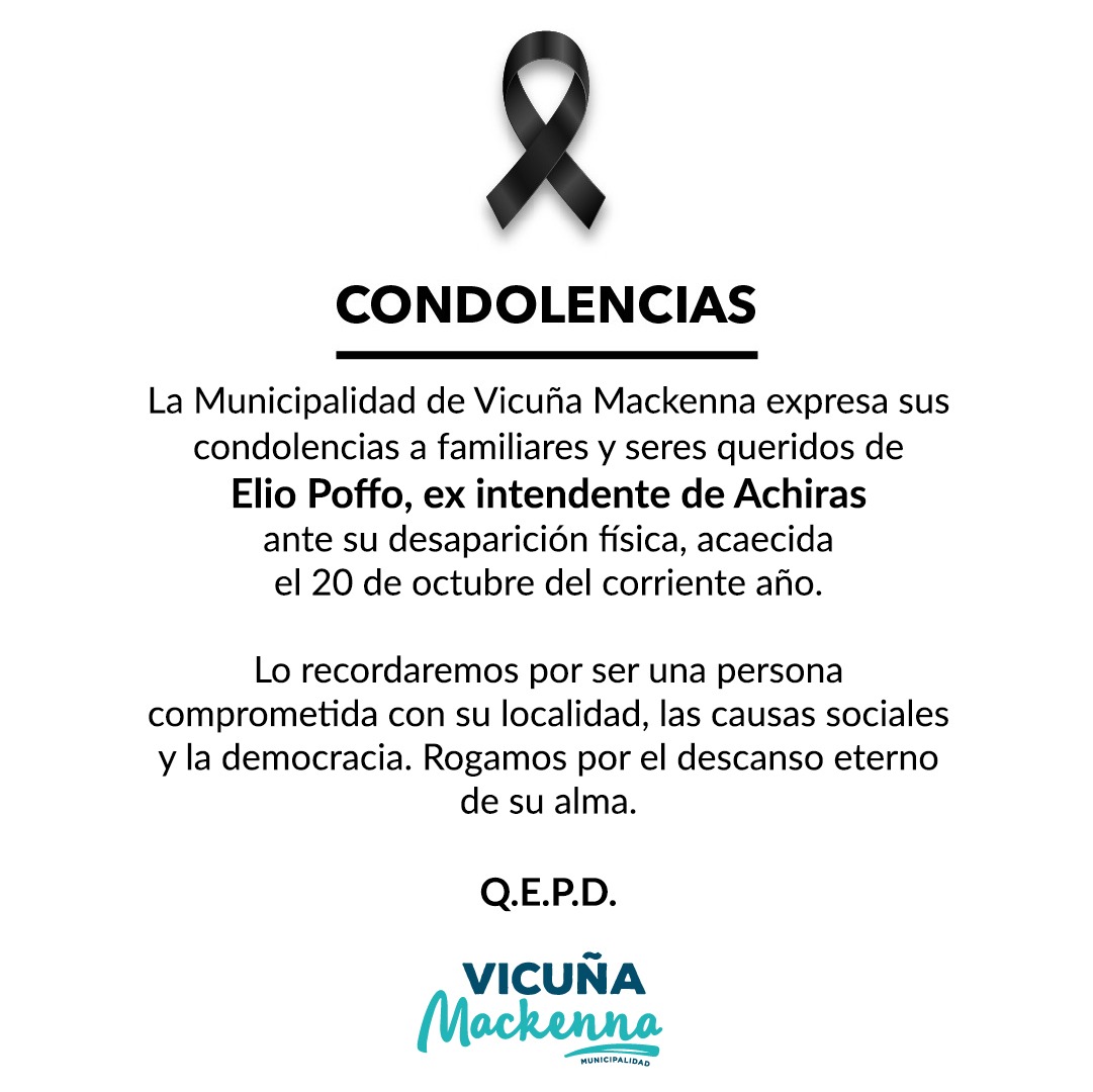 La Municipalidad de Vicuña Mackenna emitió un comunicado dando condolencias por el suceso ocurrido al ex Intendente de Achiras, Elio Poffo.