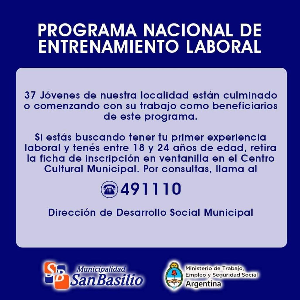 La Municipalidad de San Basilio informa que continúan abiertas las inscripciones para los entrenamientos laborales del Ministerio de Trabajo, Empleo y Seguridad Social de la Nación.