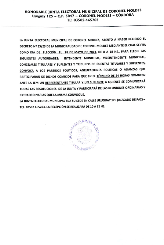 La Municipalidad de Coronel Moldes informó que el día 28 de Mayo de 2023 se llevarán a cabo las elecciones Municipales, a través del decreto 55/23, para revocar los cargos de Intendente, Viceintendente, 7 Concejales Titulares, 7 Suplentes, 3 Tribunos de Cuentas Titulares y 3 Suplentes