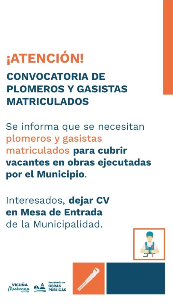 La Municipalidad de Vicuña Mackenna está buscando plomeros y gasistas matriculados para trabajar en obras públicas.