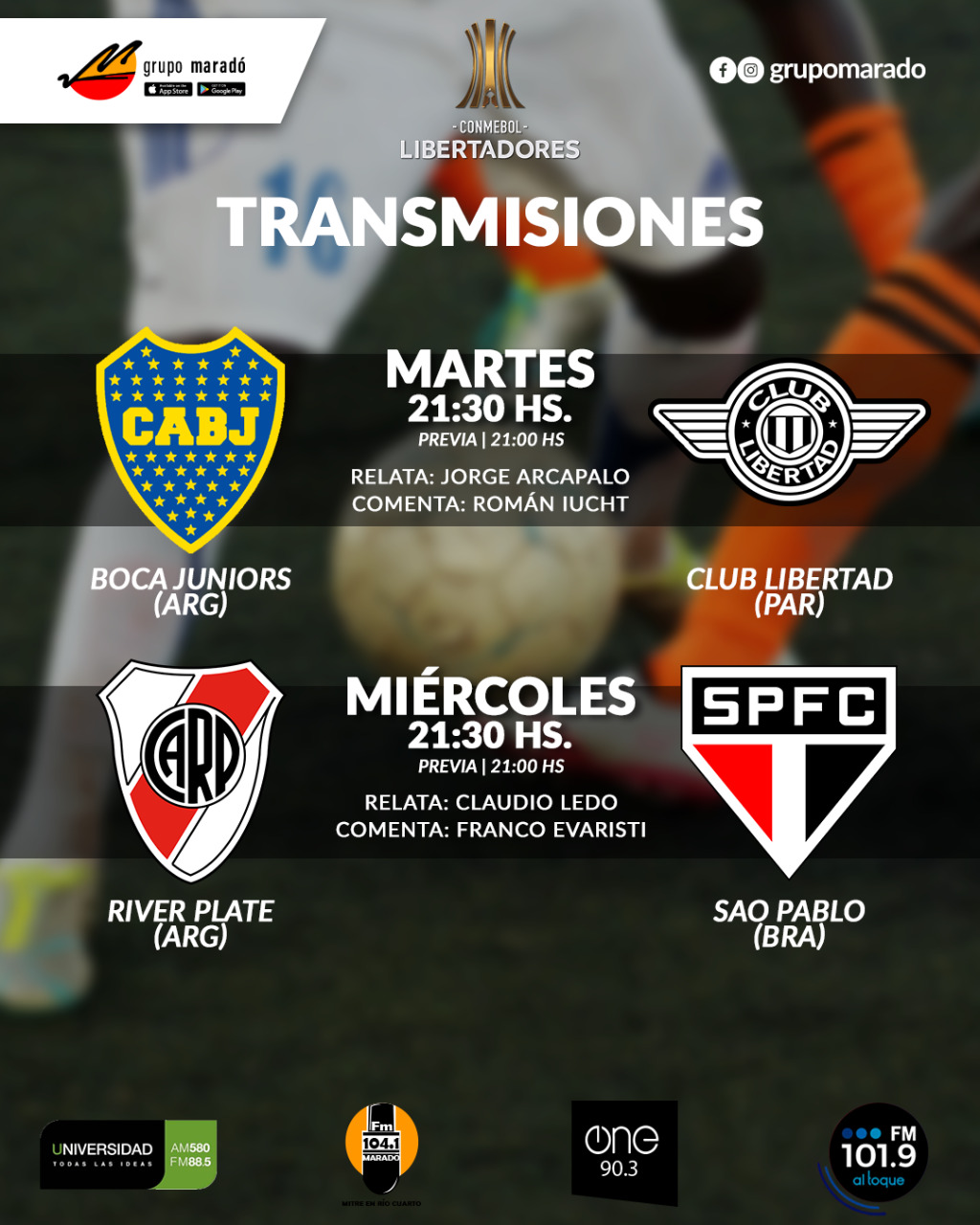 FM Samba, a través de Grupo Maradó, te invita a escuchar River-San Pablo en la 93.1. El encuentro corresponde a una nueva fecha de la fase de grupos de la Copa Libertadores.