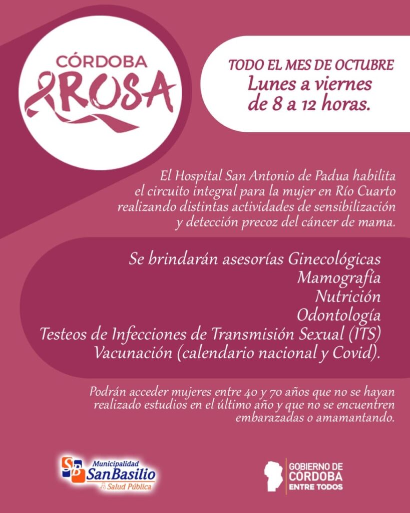Las mujeres mayores de 40 años, que no tengan obra social y deseen a hacerse una mamografía pueden acercarse el martes 26 de octubre con el DNI al Dispensario Municipal de San Basilio.
