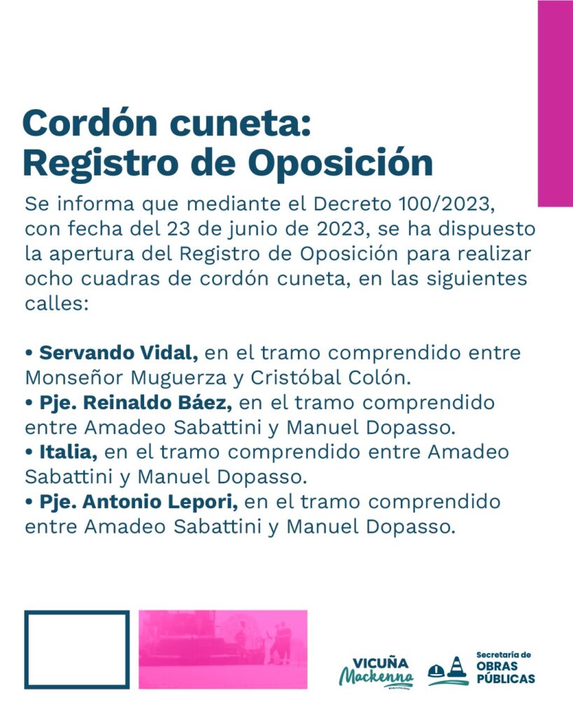 Los vecinos que se opongan a la obra podrán presentar sus reclamos en el Registro de Oposición que funcionará en la Municipalidad de Vicuña Mackenna, de 07:30 a 12:30, desde el 27/6 al 26/7 de 2023 inclusive, según lo dispone el Art. 5 de la Ordenanza Municipal N° 895/2010.
