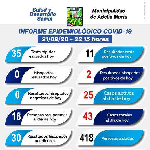 La Municipalidad de Adelia María informó el lunes 21 de septiembre, a las 22:15, que se confirmaron dos nuevos casos positivos de Covid-19.