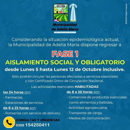 Ante el crecimiento de casos registrados en los últimos días, desde la Municipalidad de Adelia María se anunció el regreso a Fase 1 hasta el 12 de octubre.
