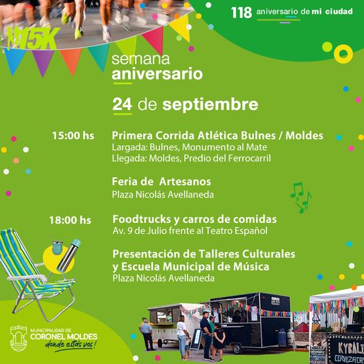 Sábado 24 de Septiembre: Primera Corrida Atlética Bulnes-Moldes Feria de Artesanos Foodtrucks Presentación de la Escuela Municipal de Música y Talleres Culturales Plaza Nicolás Avellaneda Podés llevar tu reposera y mate
