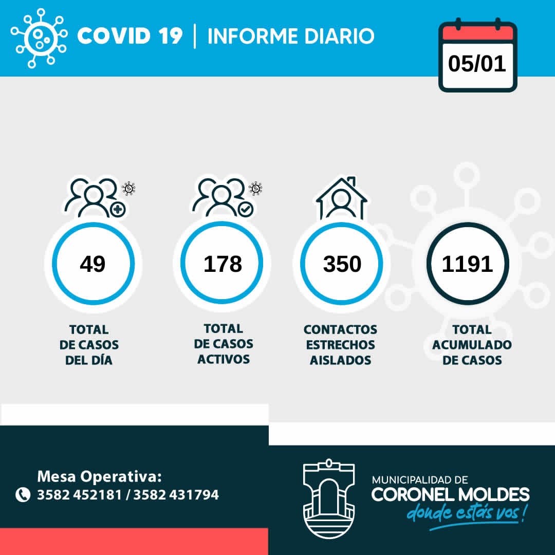 La Municipalidad de Coronel Moldes informó que, en la jornada de ayer, se registraron 49 nuevos casos positivos de coronavirus.