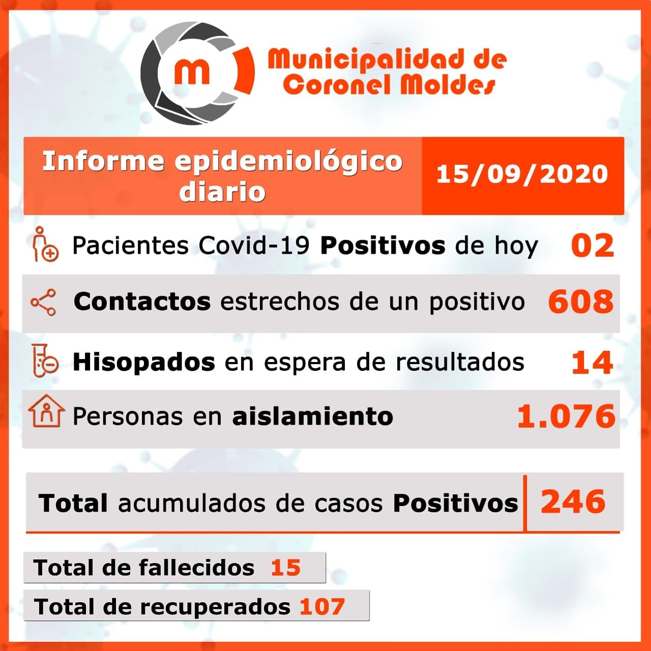 La ciudad de Coronel Moldes acumula 246 casos positivos de Covid-19. Hasta el memento se han registrado 15 fallecimientos desde el comienzo de la pandemia.