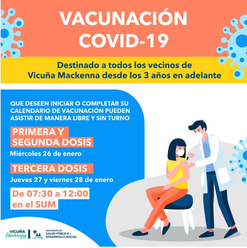 – 1era y 2da dosis: miércoles 26 de enero | 07:30 a 12:00hs en el SUM de Barrio Sur (San Martín 1131).