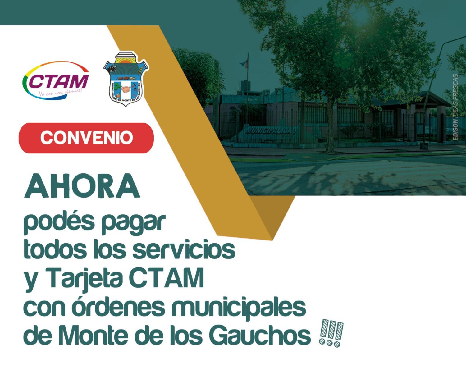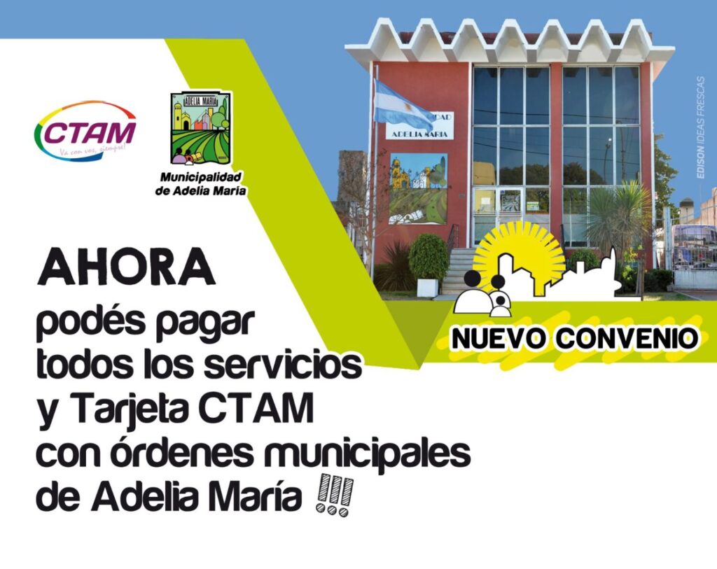 CTAM te recuerda que, a través de los convenios con las Municipalidades de Adelia María y Monte de los Gauchos, las facturas de todos los servicios y el resumen de la Tarjeta CTAM se pueden abonar con órdenes municipales también.