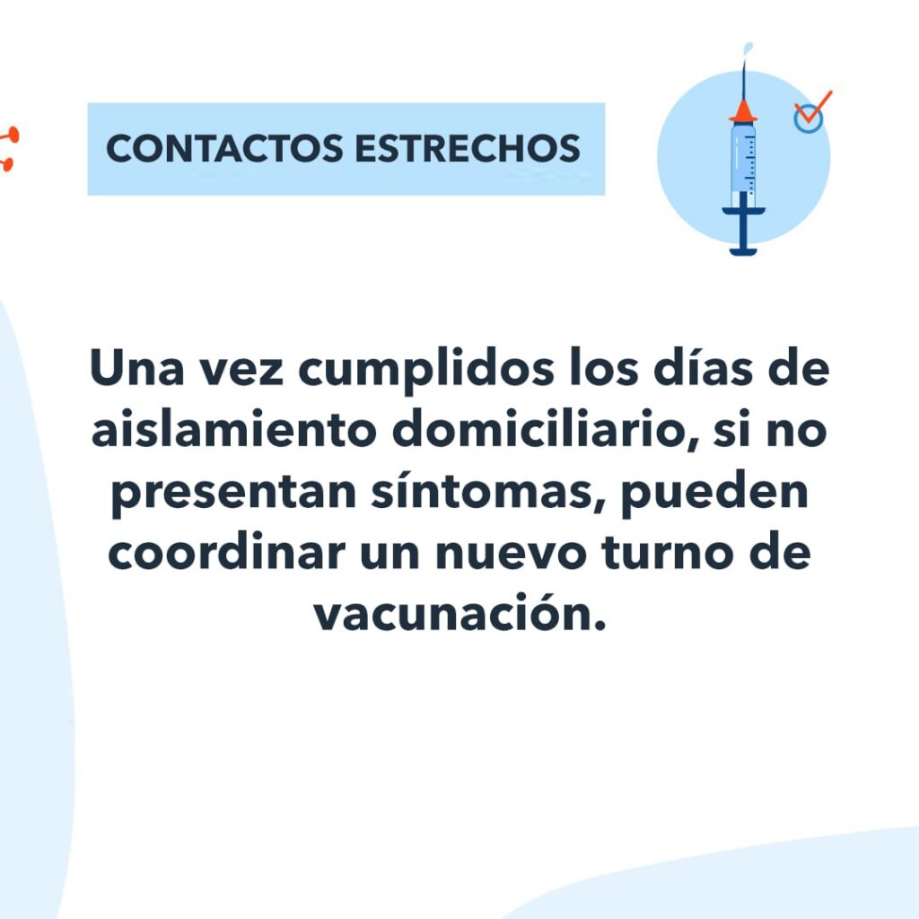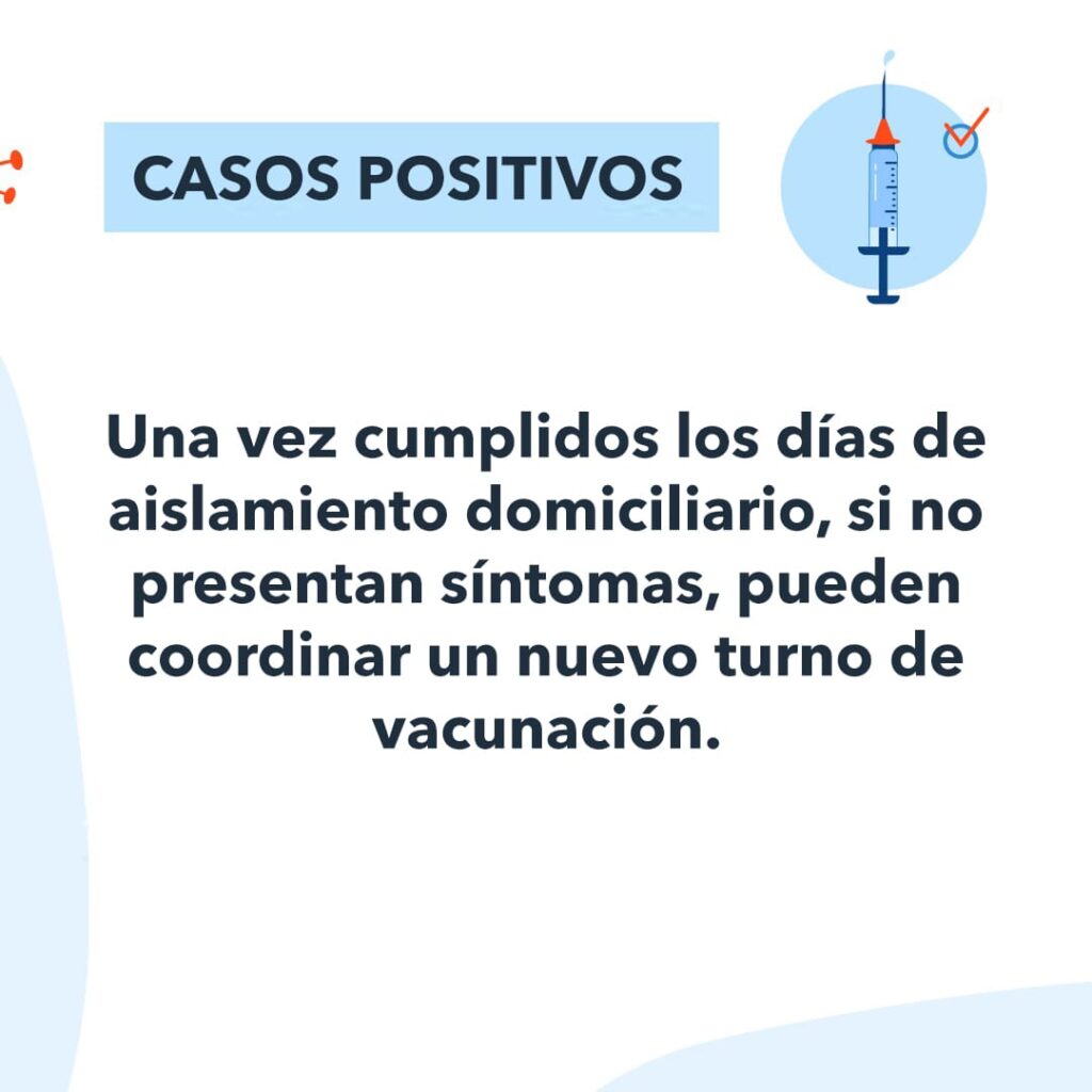 Casos positivos o contactos estrechos: una vez cumplidos los días de aislamiento, si no presentan síntomas, pueden coordinar un nuevo turno de vacunación.