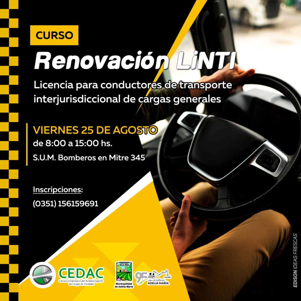 La Municipalidad de Adelia María comunica a los conductores de transporte interjurisdiccional de cargas generales que el Viernes 25 de Agosto se realizará el Curso de Renovación de LiNTI (Licencia Nacional de Transporte Interjurisdiccional) en el S.U.M. de Bomberos Voluntarios, ubicado en Mitre 345.