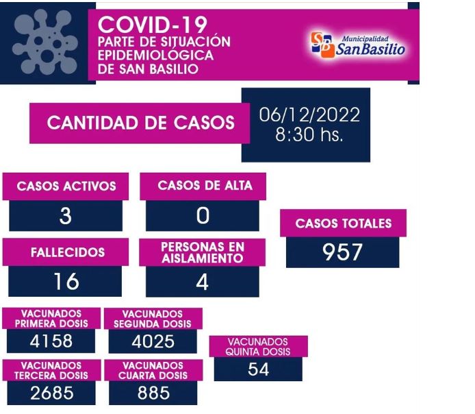 La Municipalidad de San Basilio publicó información sobre la situación epidemiológica de la localidad con los datos actualizados obtenidos hasta el día de hoy.