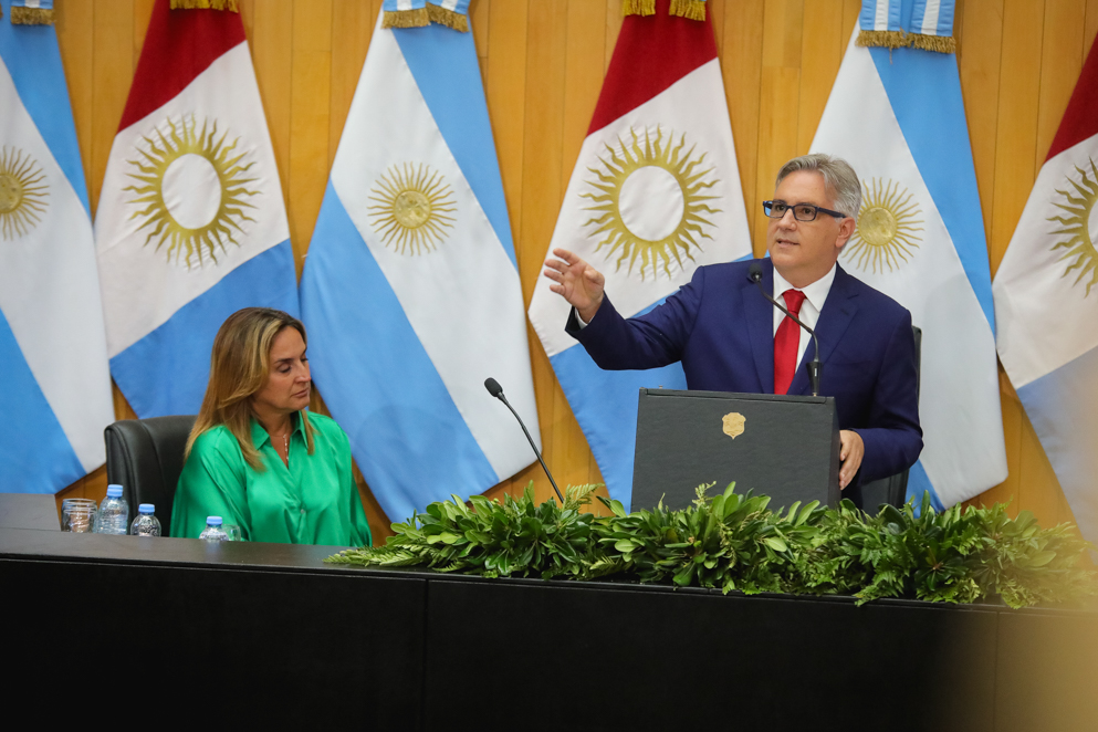 Y en eso quiero hacer un reconocimiento especial. A días de firmar ese convenio, nuestras fuerzas estuvieron desafiadas en un trabajo que hoy es digno de destacar porque lo destacan inclusive en otros países y se destaca en las fuerzas también nacionales y todo. Córdoba, en materia de la lucha contra el narcotráfico, ustedes lo saben, fuimos noticia internacional. Y fuimos noticia internacional por el trabajo profesional de las fuerzas policiales y fuimos noticia internacional por el valor de nuestros agentes. Es mentira que estas familias y esta organización tal vez hoy, una de las más buscadas y de las más violentas del mundo, se equivocó de lugar, quiso venir a instalarse Córdoba. Córdoba es hostil para los narcotraficantes y su fuerza mostró la valentía. No es que se fueron, de Córdoba los echamos, Córdoba no quiere a los narcotraficantes. Y nuestra fuerza demostró estar a la altura de esas circunstancias. Por eso pido un aplauso y vamos a condecorar a todos aquellos agentes que estuvieron en este proceso para echar a esta organización de narcotraficantes de Córdoba. Felicitaciones a los policías y felicite a los agentes que participaron de ese procedimiento. Además creo que hay que seguir. Y no hay que tenerle miedo.
