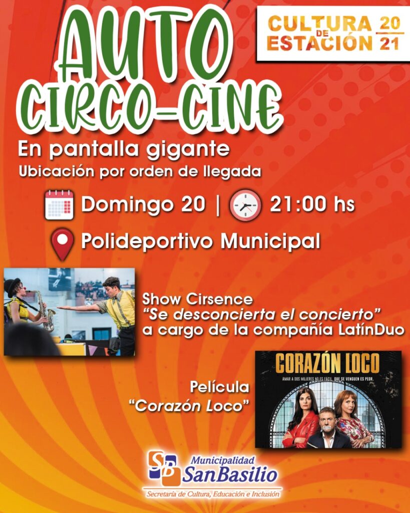 El próximo domingo 20, dando apertura a la temporada de verano 20/21, denominada Cultura de Estación, la Secretaría de Cultura, Educación e Inclusión invita a participar del primer evento de Auto Circo/Cine en nuestra localidad.