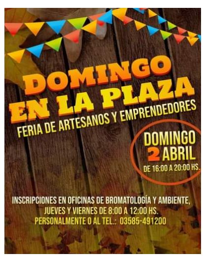 Este Domingo 2 de Abril en el horario de 16 a 20 hs se realizará una Feria de Artesanos y Emprendedores en la nueva Plaza Central de San Basilio.