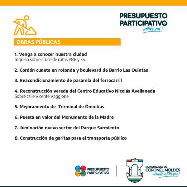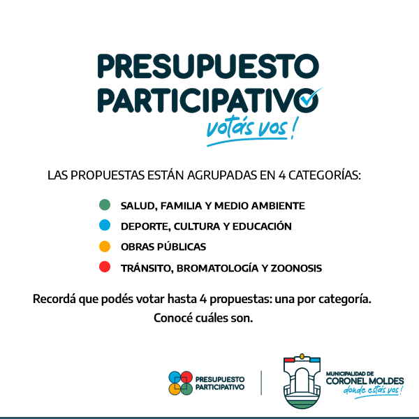 La Municipalidad de Coronel Moldes abrió la votación para los proyectos presentados por los vecinos y organizaciones en esta nueva edición del Presupuesto Participativo 2023. La votación se podrá realizar entre los días 26, 27 y 28 de Diciembre. Los proyectos presentados están agrupados en 4 categorías: