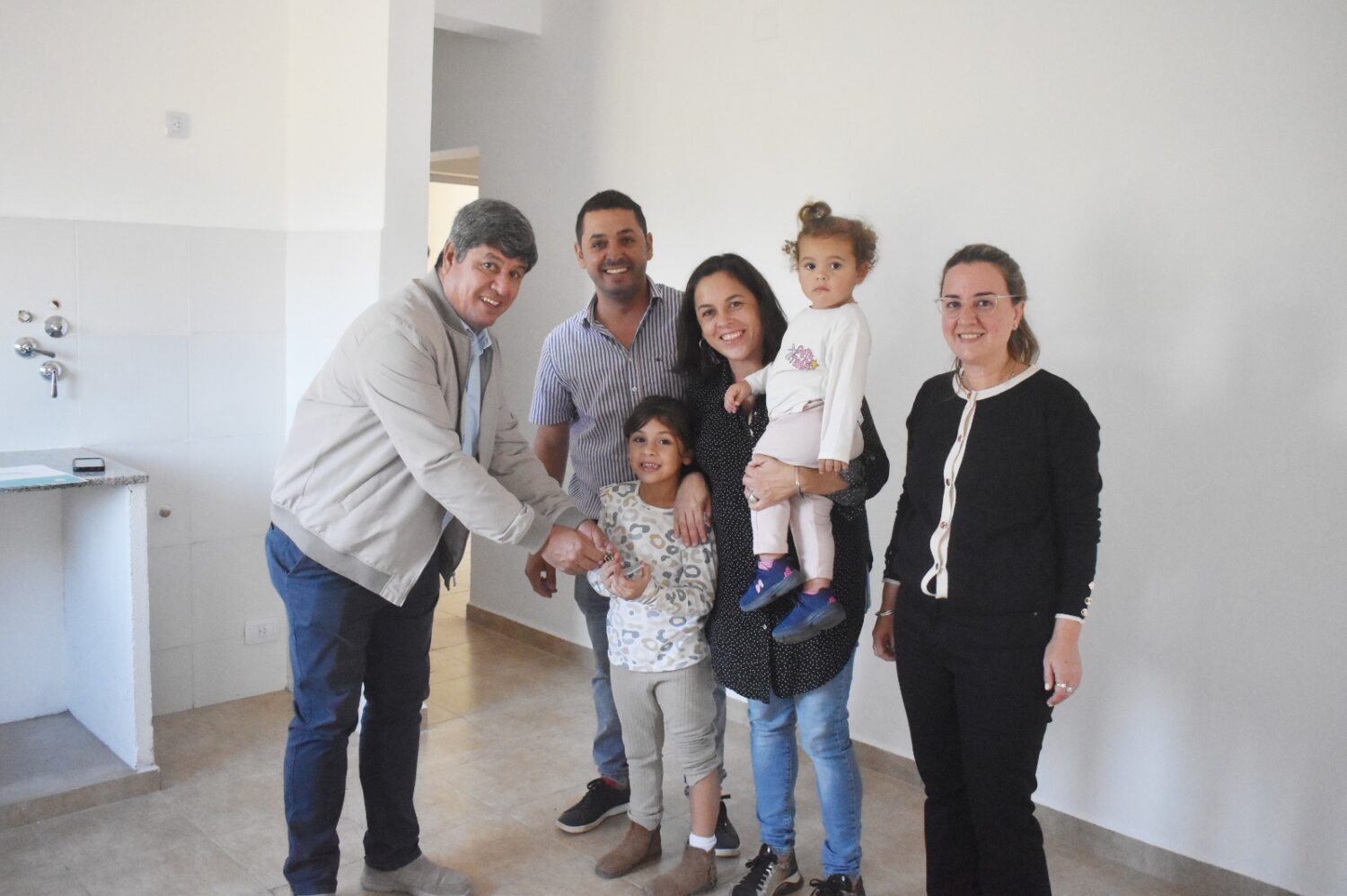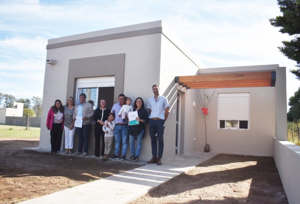 El Intendente de Vicuña Mackenna, Roberto Casari, la Secretaria de Obras Públicas y Control de Obras Privadas, Arq. Luciana Campi, la Secretaria de Salud Pública y Desarrollo Social, Lic. Ana María Paredes, y el Secretario de Gobierno y Hacienda, Lic. Agustín Peroni, hicieron entrega de las llaves a la propietaria Melina Barrasa y su familia de la nueva casa entregada en el marco del Programa de viviendas PRO.MA.VI.