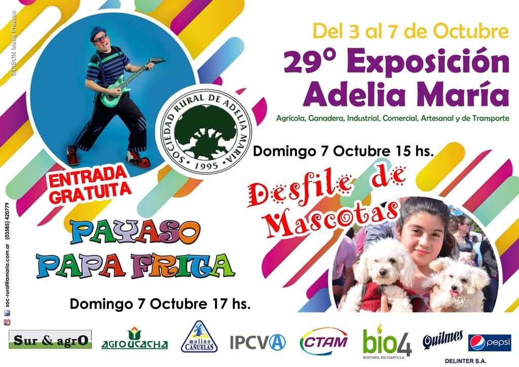 Llega el Payaso Papa Frita y el Tradicional Desfile de Mascotas, con ENTRADA LIBRE Y GRATUITA, en el marco de la 29° Exposición de Adelia María.
