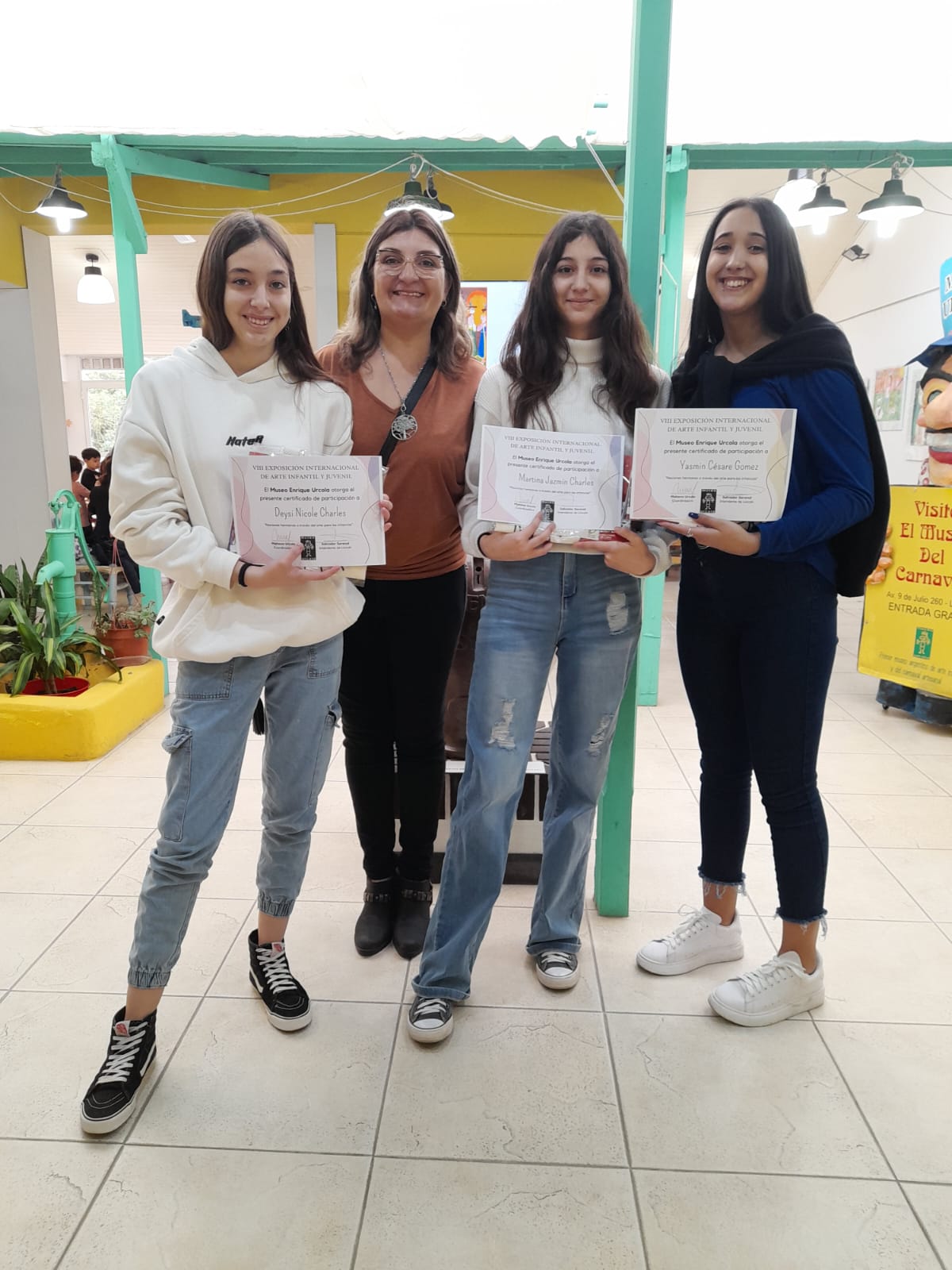 Las alumnas que ganaron el concurso de arte del Museo Enrique Urcola de Lincoln ya están en Buenos Aires junto con su profesora y otros alumnos del taller municipal de Monte de los Gauchos.