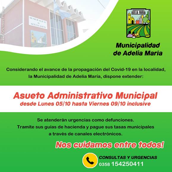 La Municipalidad de Adelia María informó que extienden el asueto administrativo municipal hasta el 9 de octubre inclusive.