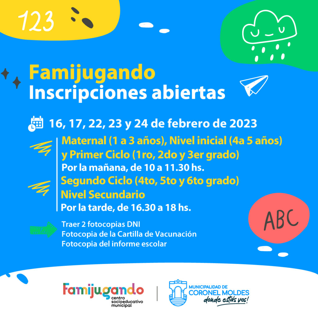 La Municipalidad de Coronel Moldes informó que se encuentran abiertas las inscripciones para Famijugando los días 16, 17, 22, 23 y 24 de Febrero del 2023. Se deberá traer 2 fotocopias del DNI, Cartilla de Vacunación y Fotocopias del Informe Escolar.