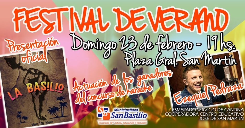 La Secretaría de Cultura, Educación e Inclusión de la Municipalidad de San Basilio invita al Festival de Verano que se realizará en plaza José de San Martín el domingo 23 de febrero a las 19.