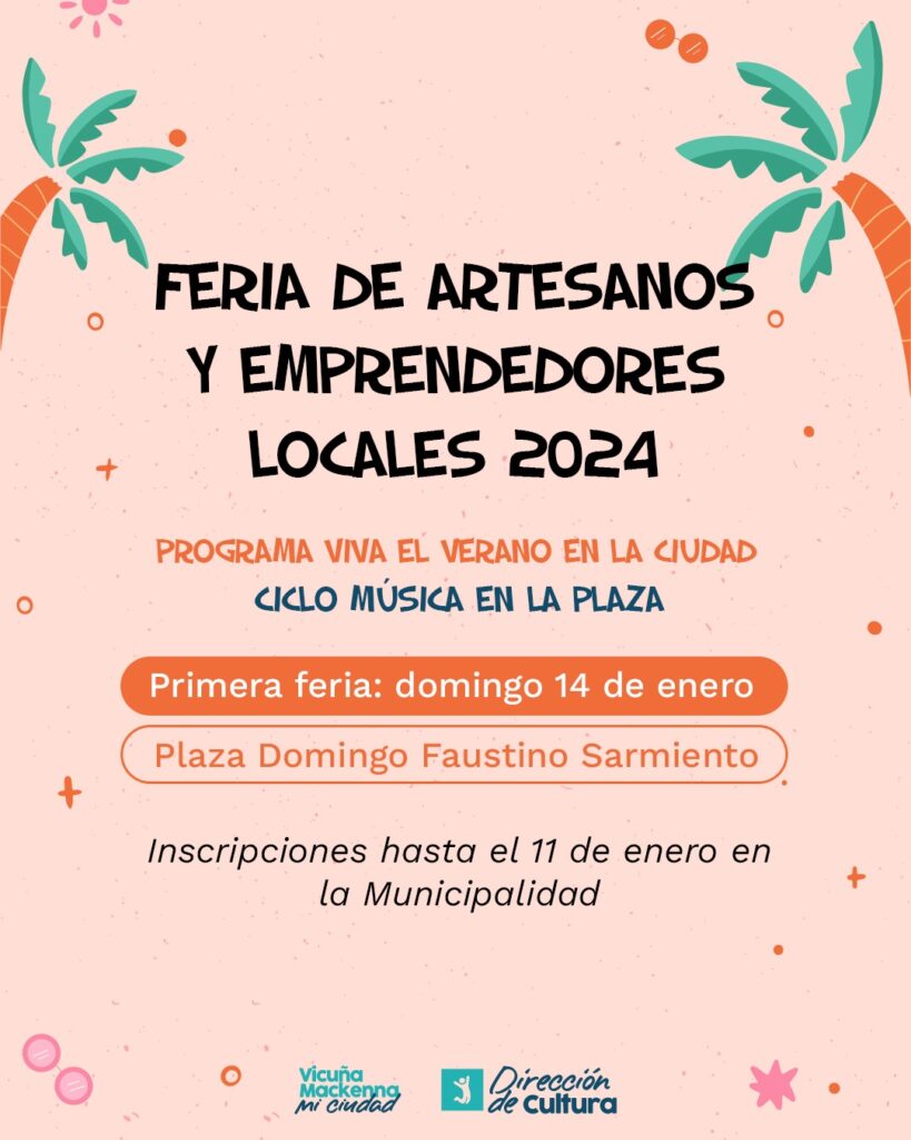 Si te gusta el arte y el emprendimiento local, no te pierdas la primera Feria de Artesanos y Emprendedores Locales 2024, que se realizará el Domingo 14 de Enero en la Plaza Domingo Faustino Sarmiento de Vicuña Mackenna.