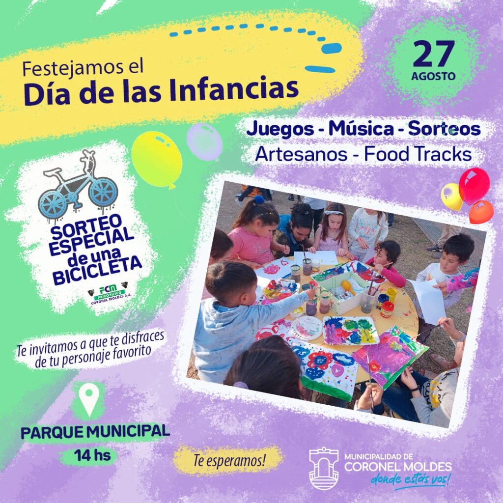 Con motivo del Día de las Infancias, el Domingo 27 de Agosto la Municipalidad de Coronel Moldes te invita al Parque Municipal, a partir de las 14 hs, para compartir una jornada divertida y especial con todas las familias de Moldes.
