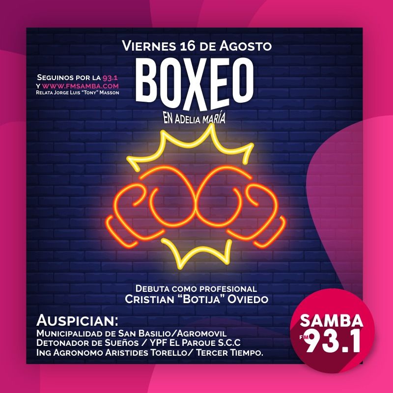 La velada comenzará a las 22 y FM Samba transmitirá los tres combates más importantes de la velada. Entre ellos, se destaca el debut profesional de Cristian «Botija» Oviedo, púgil de San Basilio y de ascendente carrera en el terreno amateur.