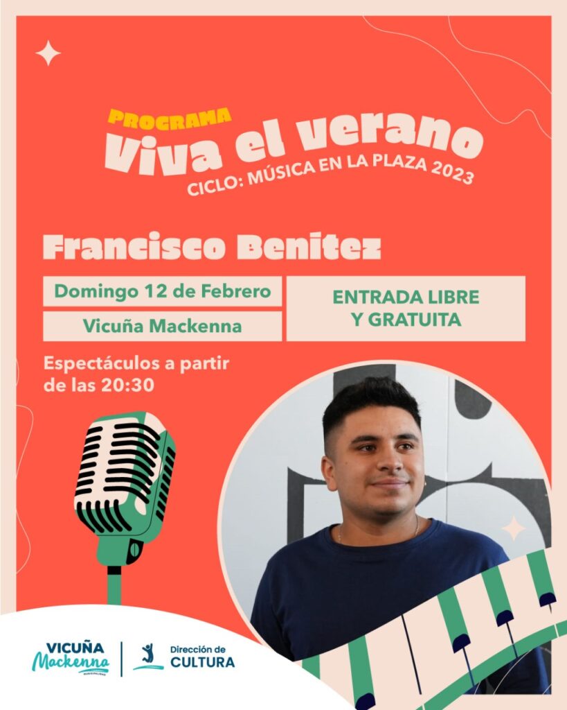 El próximo Domingo 12 de Febrero a partir de las 20:30 hs en la Plaza Domingo F. Sarmiento de la localidad de Vicuña Mackenna, se desarrollará otra jornada del ciclo de música en la plaza, Viva el Verano.