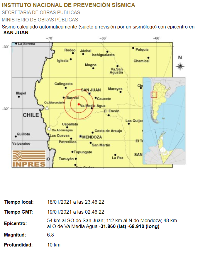 Un fuerte temblor sacudió a gran parte de la región cuyo y centro del país. Según informó el Instituto Nacional de Prevención Sísmica (INPRES) el epicentro fue en San Juan y se registró a las 23:46.