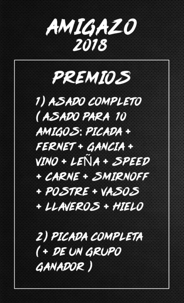 ? 1)ASADO COMPLETO (10 personas ) 2do premio ) tablas de picadas para amigos 3ro) pizzeada para amigos – más de 7 grupos obtienen premio ? (bebida incluida )