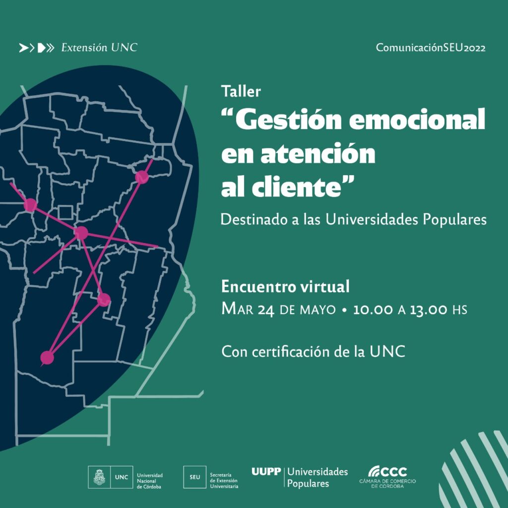 El Martes 24 de Mayo, a partir de las 10 a.m se llevará a cabo un taller virtual de Gestión Emocional de atención al cliente, coordinado por la Cámara de Comercio de Córdoba y Programa Universidades Populares de la Secretaría de Extensión UNC.