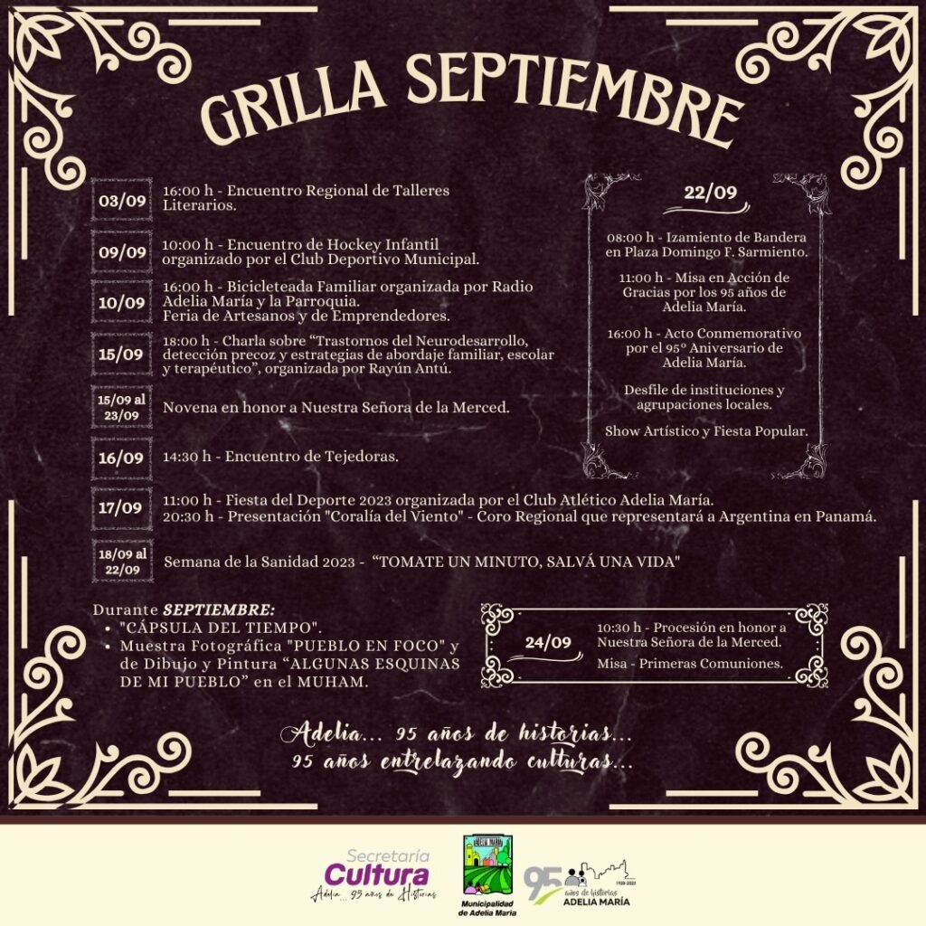 Se publicó la Grilla de actividades a desarrollarse en el mes de Septiembre en el marco de los 95° Aniversario de Adelia María.
