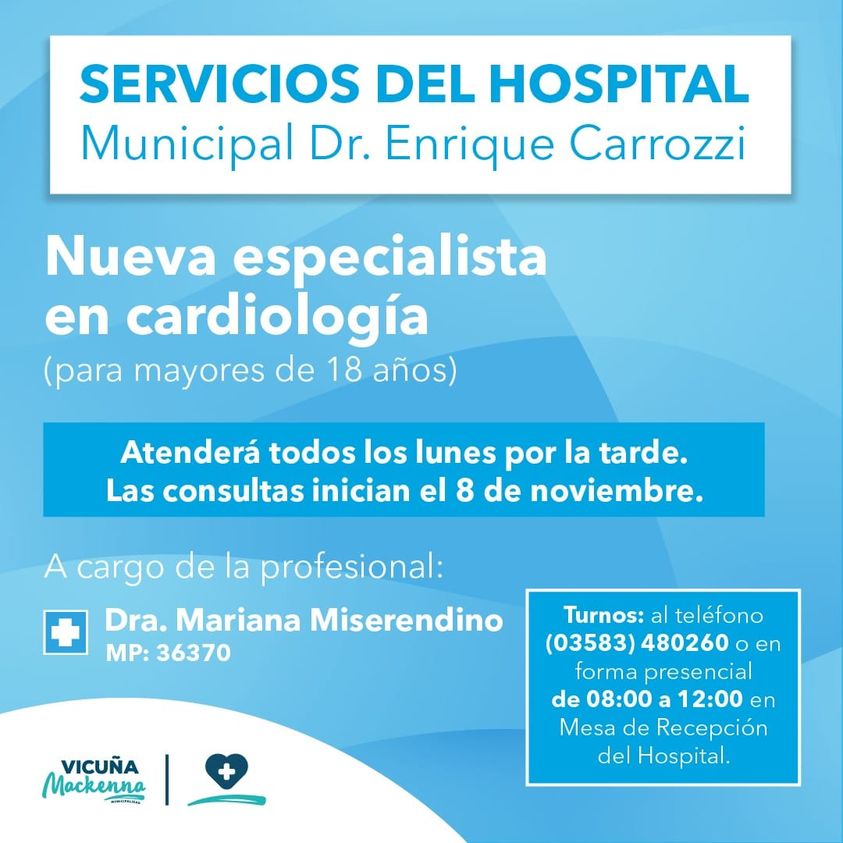 Para solicitar turnos, comunicarse al (03583) 480260 o en forma presencial en Mesa de Recepción del Hospital, de 08:00 a 12:00.