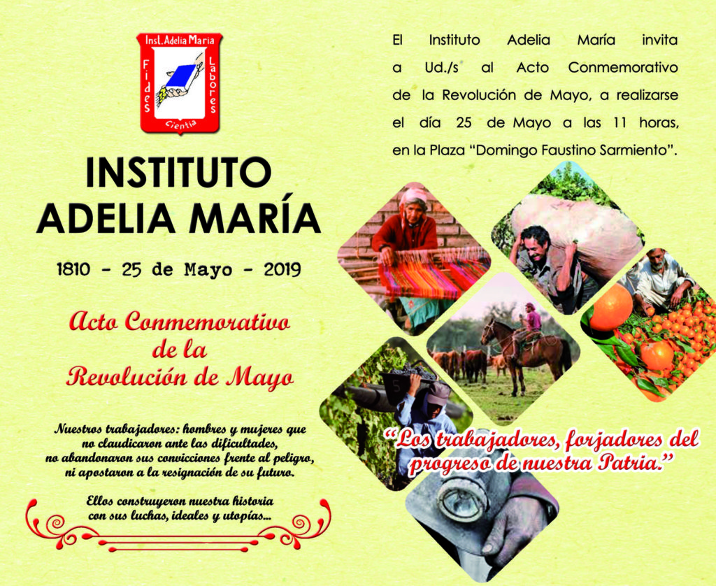 El Instituto Adelia María realizará un acto conmemorativo de la Revolución de Mayo, el 25 del mismo mes, a las 11 horas.