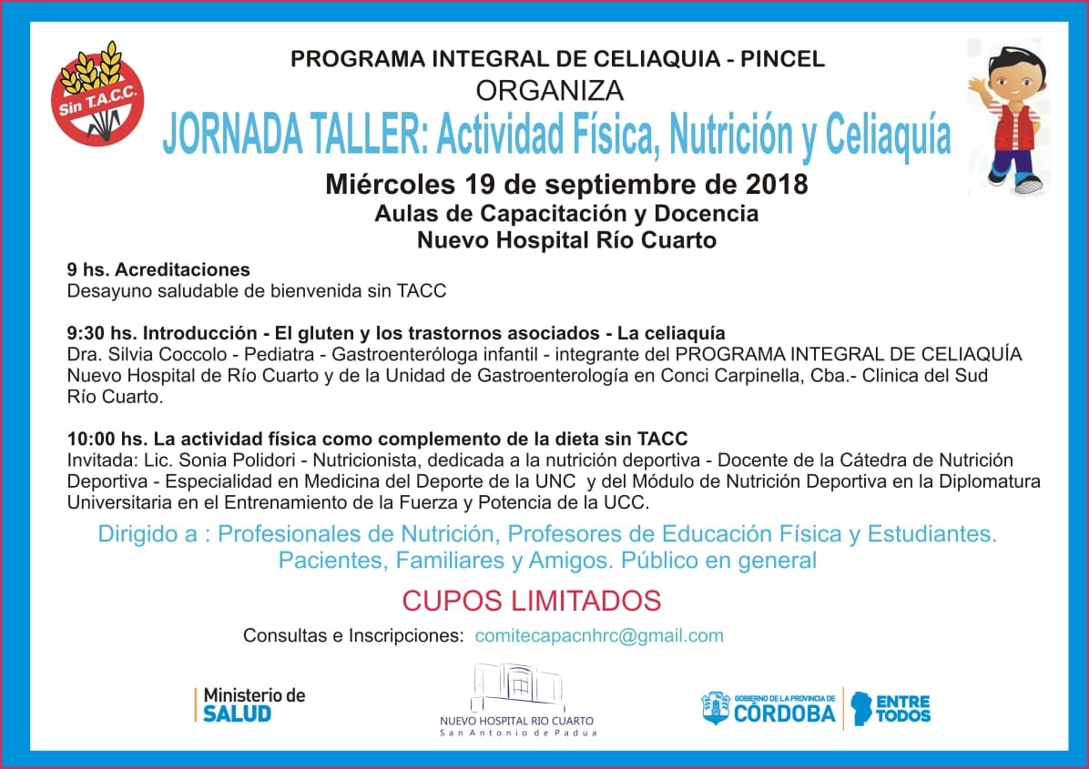 El Centro de Salud Municipal hace extensiva la invitación del Hospital de Río Cuarto a nutricionistas y profesores de educación física de nuestra localidad a participar del taller de capacitación en actividad física, nutrición y celiaquía que se dictará el miércoles 19 de septiembre en las aulas de capacitación y docencia del nuevo hospital de Río Cuarto.