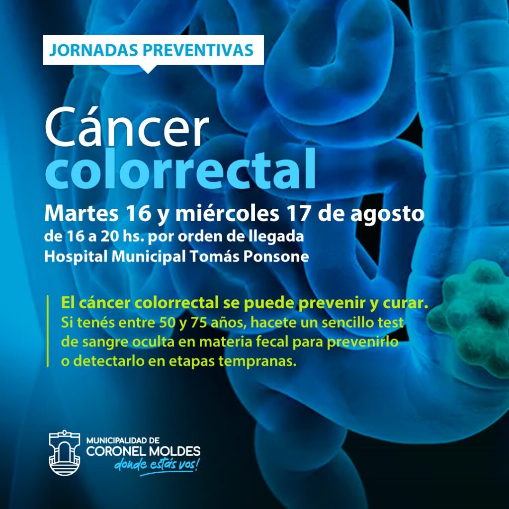Este Martes 16 y Miércoles 17 de Agosto, desde las 16 a 20 hs, se realizará el control para la Prevención del Cáncer Colorrectal, de manera gratuita y por orden de llegada en el Hospital Municipal Tomás Ponsone de Coronel Moldes.