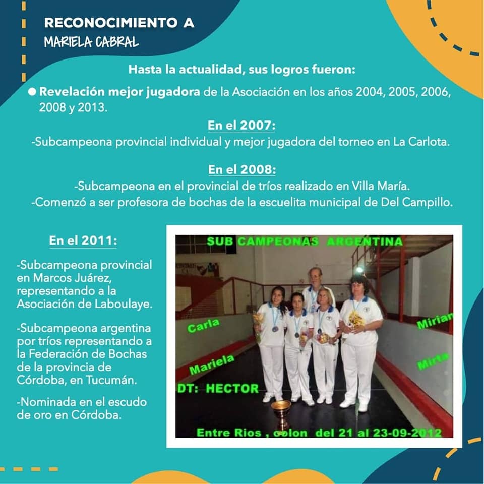 La Dirección de Deportes de Vicuña Mackenna reconoció a Mariela Cabral, por su desempeño como jugador de bochas.