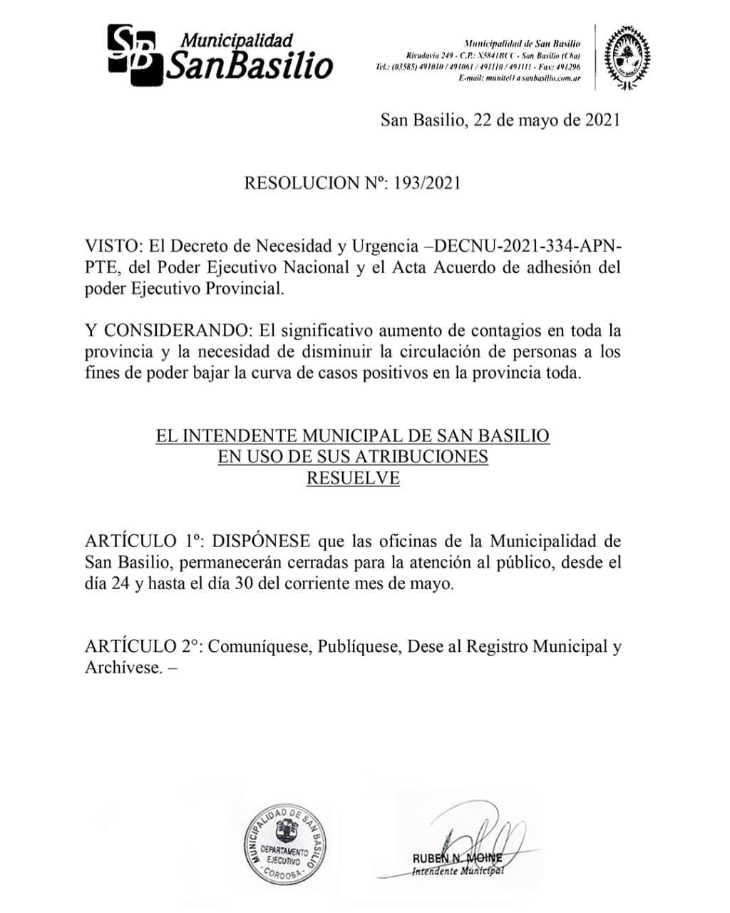 La Municipalidad de San Basilio, a través de un decreto firmado por el intendente Rubén Moine, informa que las oficinas municipales permanecerán cerradas hasta el 30 de mayo.