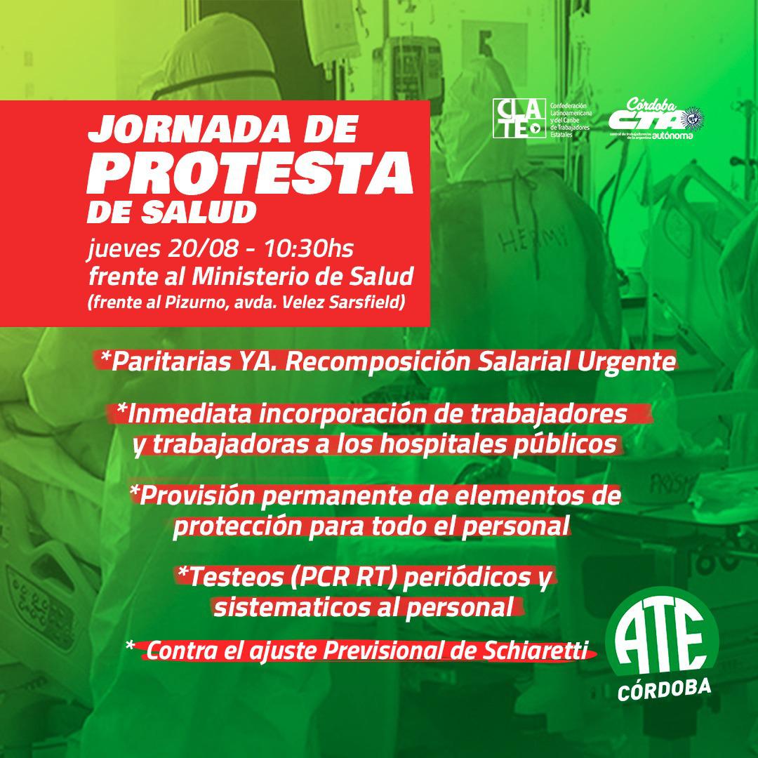 Con un acto que tendrá lugar a las 10.30, frente al Pablo Pizzurno de la avenida Vélez Sarsfield de la Ciudad de Córdoba, los trabajadores nucleados en ATE y en la CTA Autónoma, volverán a reclamar por la apertura de paritarias, la incorporación “urgente” de personal a hospitales públicos, el pase a planta del personal precarizado y la provisión permanente y adecuada de equipos de protección personal para todo el personal.